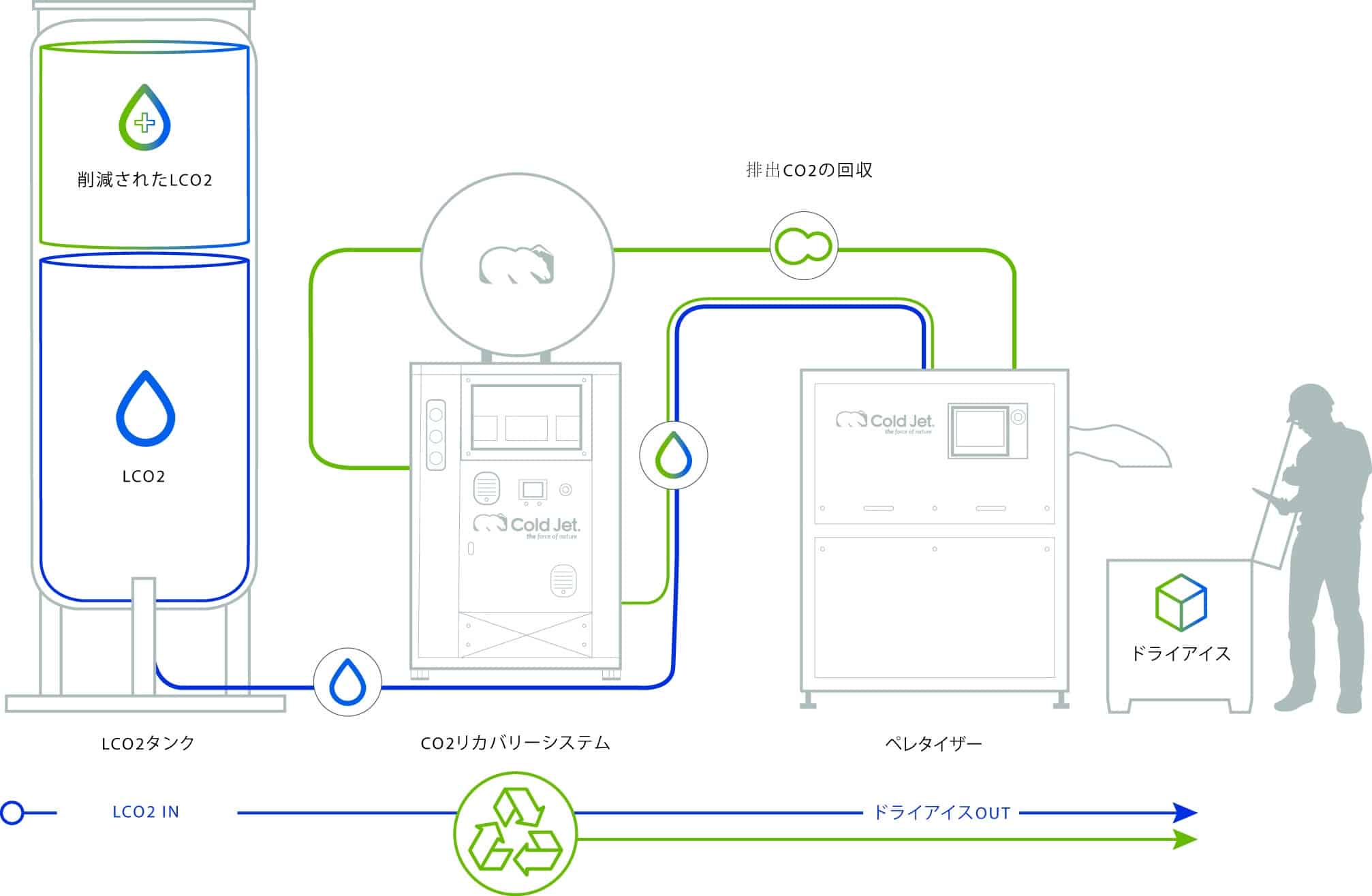 当社の RE-CO2 回収システムは、Cold Jetペレタイザー・多くの他社製品とも互換性があり、また自動洗浄機システムも簡単に統合することが可能です。